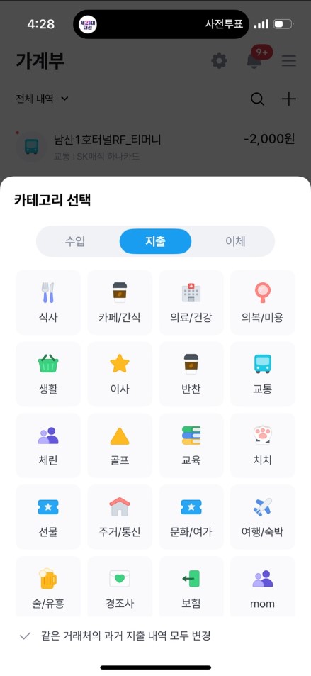(예: 식사, 의복/미용, 교육, ‘mom’ 항목 등)