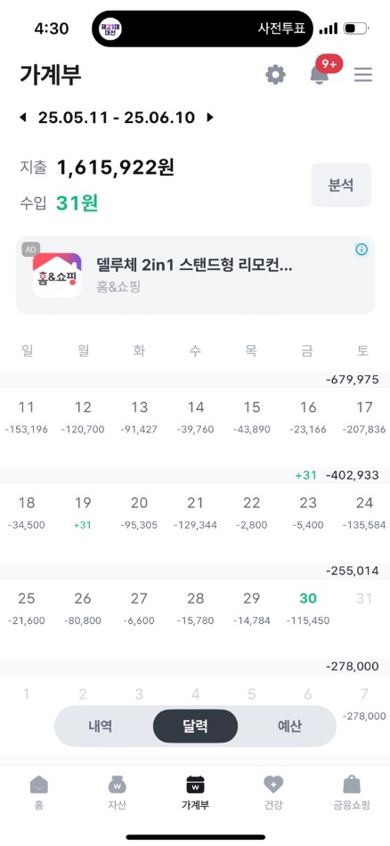 계좌·카드 자동 지출/수입 연동이 되어 파악하기에 쉽고, 달력 보기와 월별 분석이 명확하며,
